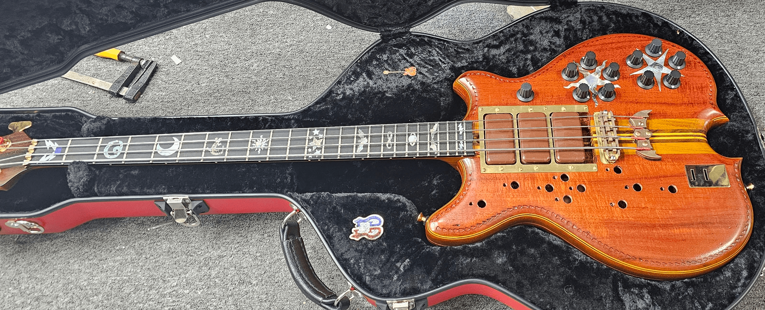The original Mission Control bass, by Rick Turner, made its debut with the Grateful Dead on June 16, 1974. This revolutionary instrument helped pioneer the concept of boutique basses and appeared in numerous historic performances, including the legendary Cornell show and the pyramids of Egypt.